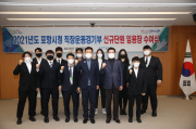 포항시는 우수한 선수 영입을 통한 전력보강으로 국내외 포항의 위상을 알리기 위해 6일 시청 소회의실에서 ‘직장운동경기부 신규단원 임용장 수여식’을 개최했다. 이날 수여식은 코로나19로 인하여 예년에 비해 참석인원을 대폭 축소하여 신규단원, 지도자 등 16명이 참석한 가운데 신규단원 임용장 수여, 선수 선서,..