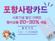 포항시는 7월 愛 모바일 포항사랑카드 결제시스템 도입과 이달 포항에서 개최되는 ‘제60회 경북도민체전’을 기념하기 위해 포항시 온라인 쇼핑몰 ‘포항마켓’에서 최대 30% 할인 프로모션을 진행한다고 밝혔다. 이번 이벤트는 오는 7월 12일부터 7월 16일까지 5일간이며, 38개 업체의 300여 개 품목을 대상으로 20~30..