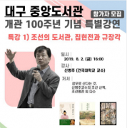 대구시립중앙도서관(관장 장해광)은 개관 100주년을 맞아 8월 2일(금) 오후 4시부터 “조선의 도서관, 집현전과 규장각”이라는 주제로 진행되는 신병주 건국대 교수의 특별 강연 신청을 7월 10일(수)